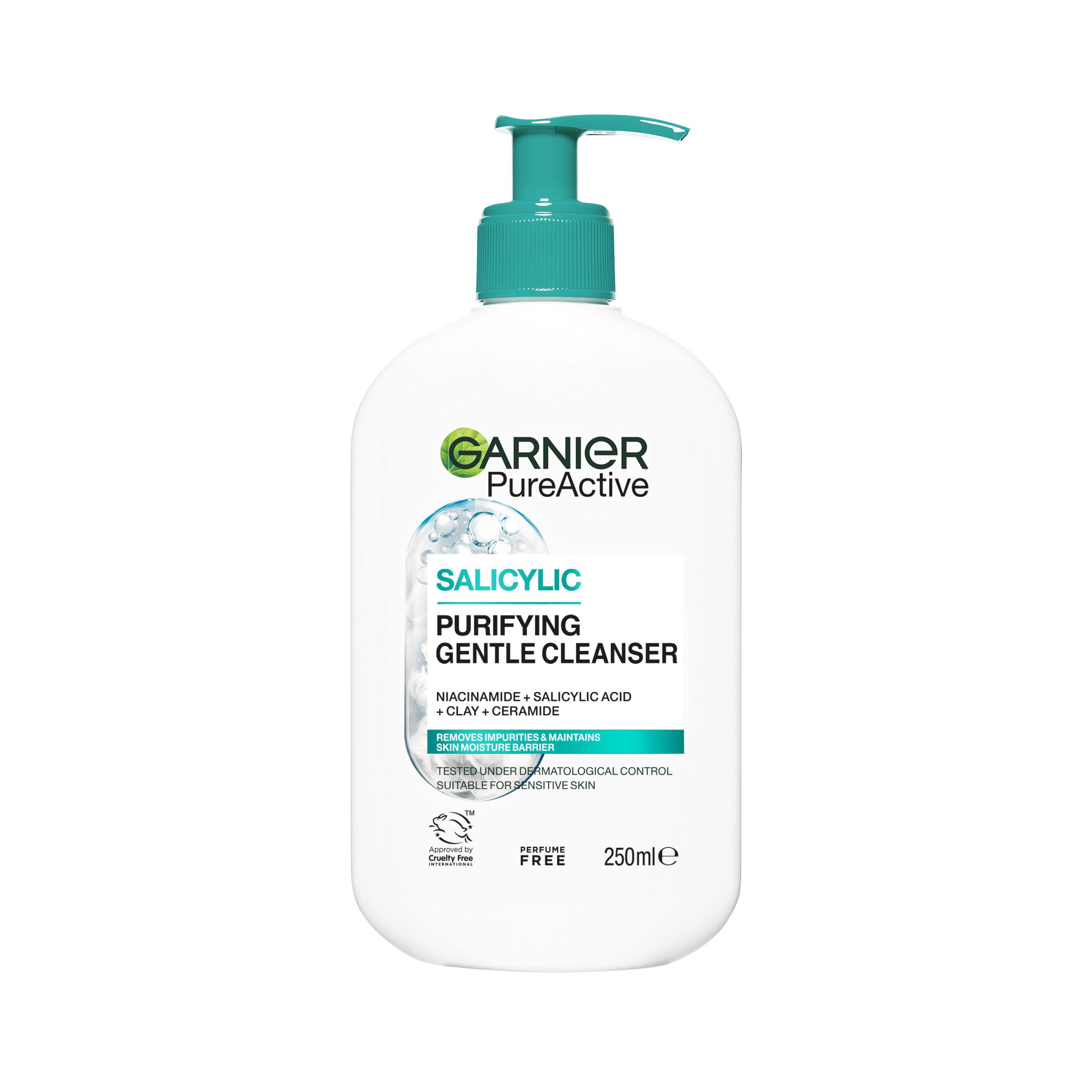 - Garnier PureActive Salicylic Purifying Gentle Cleanser – Återfuktande ansiktsrengöring som varsamt tar bort orenheter, minimerar synligheten av porer och bidrar till en jämnare hudton samtidigt som hudens barriär skyddas.